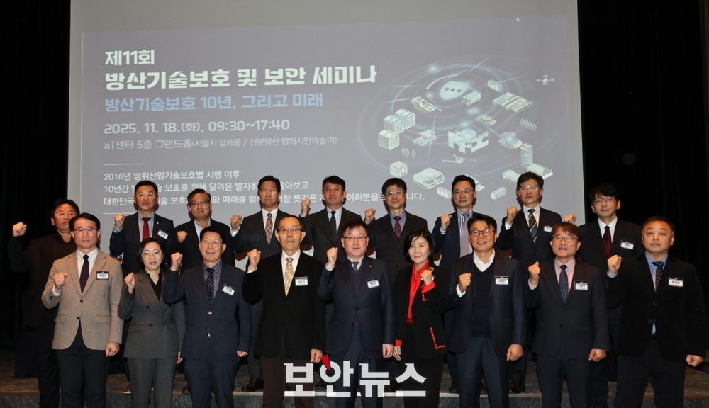 한국방위산업진흥회, 한국방위산업학회, 한국국방기술학회가 공동 주최하고, 방산기술보호연구회와 국방AI사이버보안연구회, 명지대 방산안보연구소가 주관한 제11회 방산기술보호 및 보안 세미나가 18일 서울 양재동 aT센터 5층 그랜드홀에서 성황리에 개최됐다.