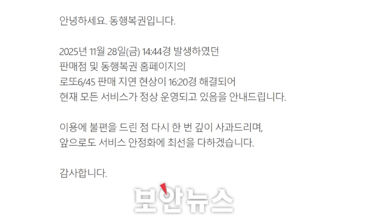 동행복권 측은 “현재 모든 서비스가 정상 운영되고 있다”면서 “이용에 불편을 드린 점 다시 한 번 깊이 사과드린다”고 했다.
