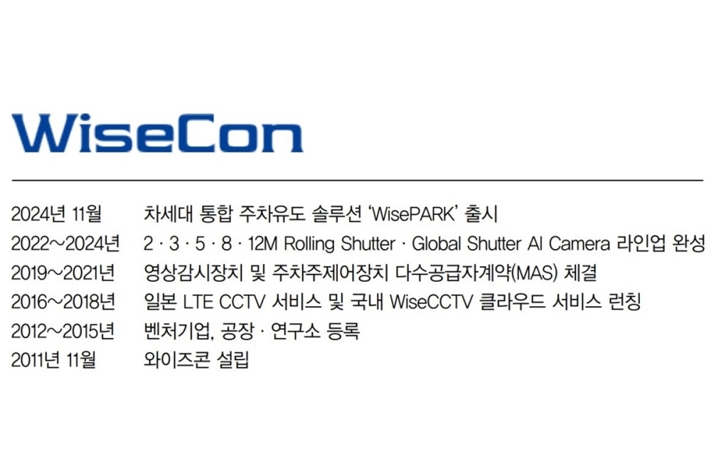 Q. ‘지속 가능한 지혜(Continue to be Wise)’라는 철학을 사명에 담은 와이즈콘은 어떤 회사인가요? 와이즈콘은 온디바이스(Edge) AI 카메라와 이를 기반으로 한 ITS(Intelligent Transport Systems), LPR(License Plate Recognition) 및 주차관제 솔루션을 직접 개발·생산하는 시각 지능 카메라 기업입니다. 2000년대 초반, IP 카메라 초기 기술을 개발하던 멤버들이 합심해 2011년에 설립했습니다.