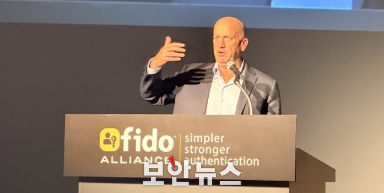 ▲앤드류 시카르 FIDO얼라이언스 CEO가 5일 도쿄에서 열린 ‘FIDO 도쿄 세미나’에서 기조연설을 하고 있다. [자료: 보안뉴스]