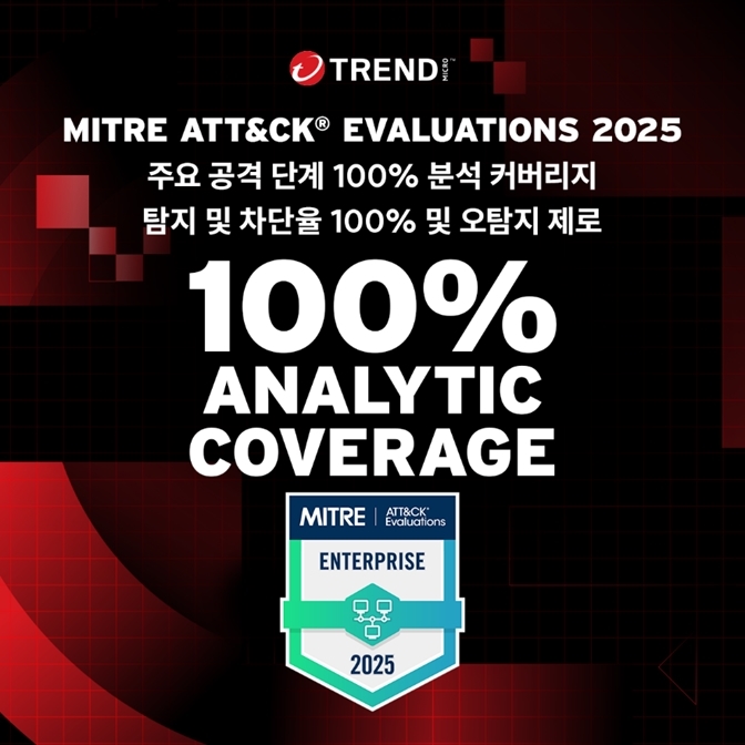 [보안뉴스 강현주 기자] 글로벌 AI 사이버보안 기업 트렌드마이크로(한국지사장 김진광)는 마이터 엔지뉴어티가 실시한 최신 ‘어택’ (ATT&CK) 평가에서 자사 통합 보안 플랫폼 ‘트렌드 비전 원(Trend Vision One)’이 탁월한 위협 탐지 및 대응 능력을 입증했다고 15일 밝혔다.