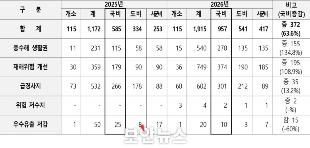 세부사업은 5개 분야에 걸쳐 추진되며, 전년 대비 대폭 증액된 예산을 바탕으로 재해취약지역을 정비할 계획이다.