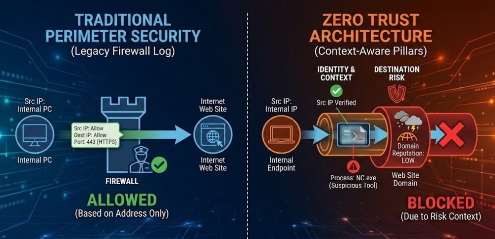 하지만 제로트러스트 관점에서 필러를 기반으로 통제할 경우 상황은 완전히 달라질 수 있다. 동일한 외부 443 포트로의 통신이라 하더라도, 일반적인 브라우저 트래픽이 아닌 Netcat 기반 통신이며, 더 나아가 평판 조회 결과가 좋지 않은 외부 사이트로 연결된다면, 이는 일상적 웹 통신이 아니라 데이터 유출을 위한 비정상 행위로 의심해야 한다.