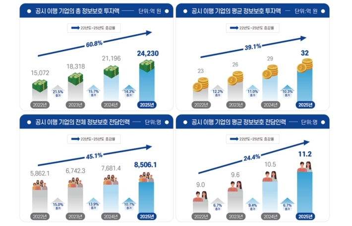 [보안뉴스 강현주 기자] 2025년 정보보호 공시를 한 773개사는 기업당 평균 약 32억원을 보안에 투자한 것으로 나타났다. 전년대비 10.3% 증가한 수치다. 인력은 평균 11.2명으로 전년대비 6.7% 늘었다.