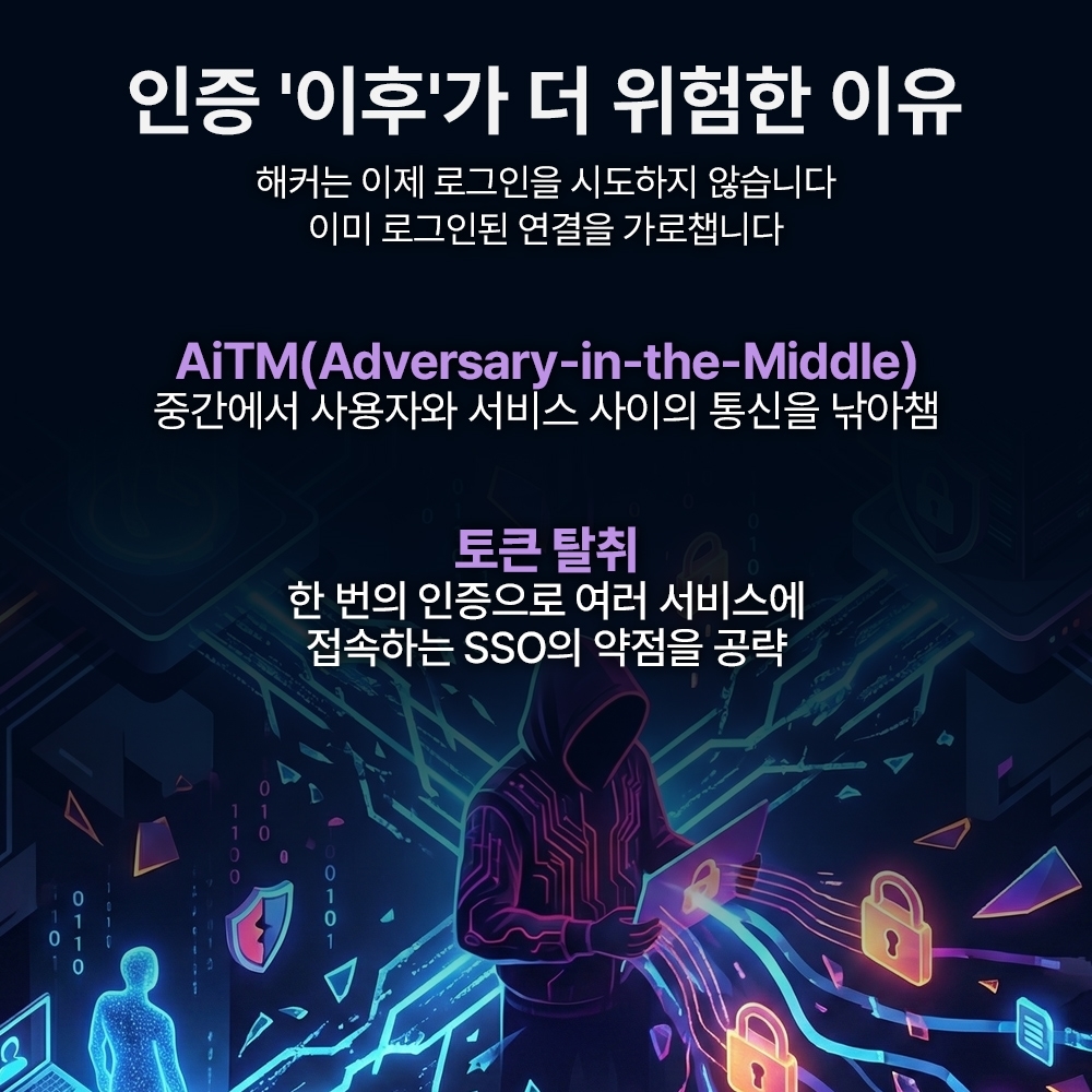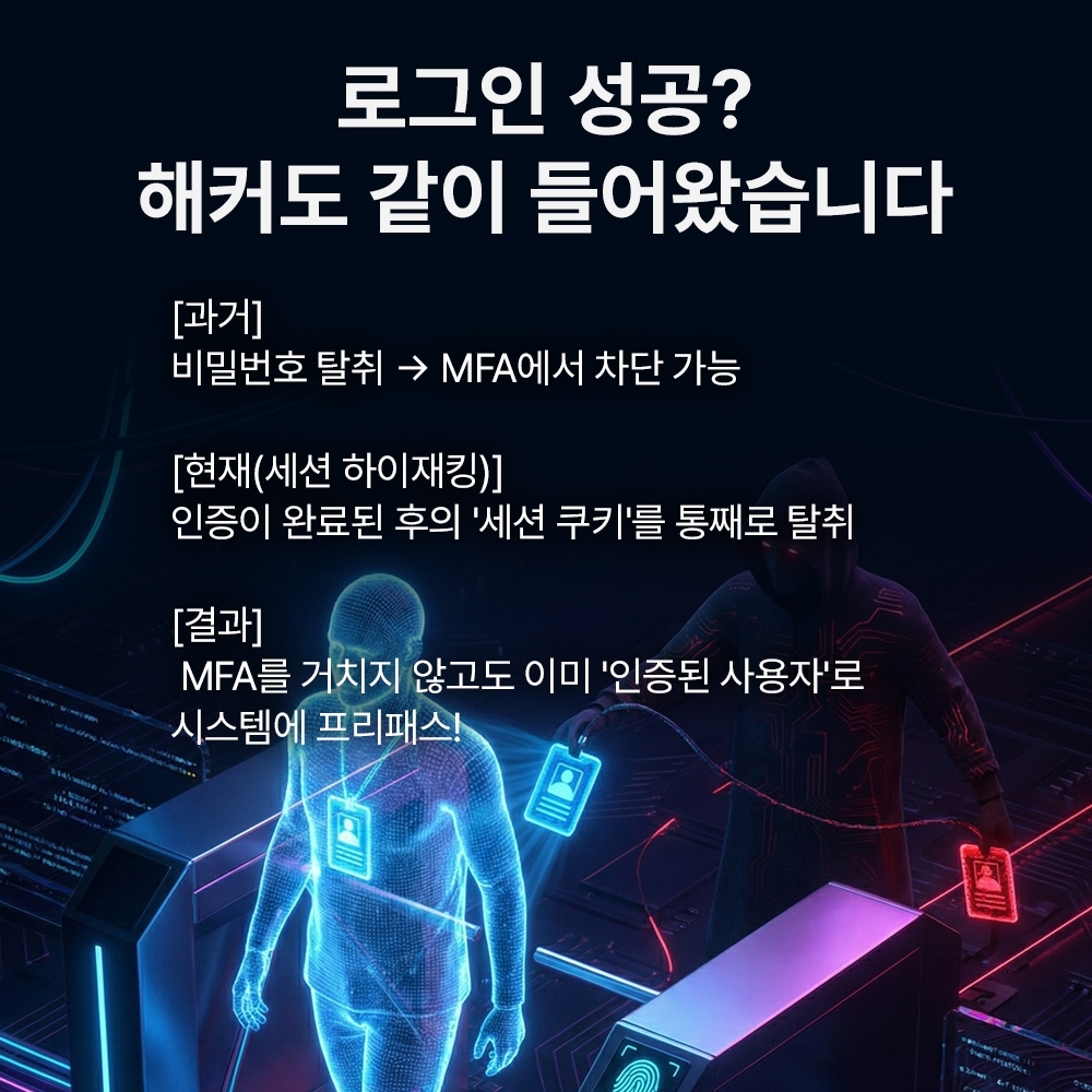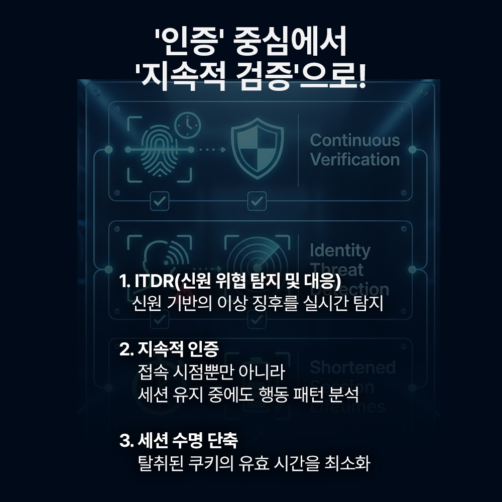 해커들의 공격 방식이 단순 ID/비번 탈취를 넘어, MFA(2단계 인증)를 우회하고 이미 인증된 연결을 가로채는 ┖세션 하이재킹┖ 및 ┖토큰 탈취┖로 고도화되고 있다. 사용자, 기기, 앱을 연결하는 신원 보안망인 ┖아이덴티티 패브릭(Identity Fabric)┖이 위협받고 있으며, 기존의 단발성 인증 방식으로는 로그인 이후의 침입을 막을 수 없다. 이에 대한 해결책으로 접속 시점뿐만 아니라 세션 유지 중에도 이상 징후를 실시간으로 분석하는 ┖ITDR(신원 위협 탐지 및 대응)┖과 ┖지속적 검증┖ 체계로의 전환이 시급하다.