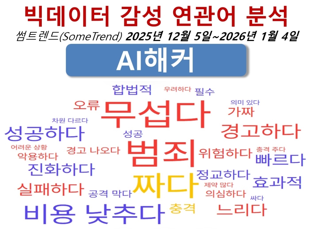 그렇다면 AI 해커에 대한 빅데이터 반응은 어떨까. 빅데이터 심층 분석 도구인 썸트렌드(SomeTrend)로 지난해 12월 5일부터 올해 1월 4일까지 AI 해커에 대한 빅데이터 감성 연관어를 도출해 보았다. AI 해커에 대한 빅데이터 감성 연관어는 ‘범죄’, ‘무섭다’, ‘짜다’, ‘비용낮추다’, ‘경고하다’, ‘성공하다’, ‘빠르다’, ‘효과적’, ‘느리다’, ‘실패하다’, ‘진화하다’, ‘위험하다’, ‘가짜’, ‘오류’, ‘합법적’, ‘충격’, ‘정교하다’, ‘경고나오다’, ‘필수’, ‘성공’, ‘의심하다’, ‘공격막다’, ‘악용하다’, ‘충격주다’, ‘차원다르다’, ‘어려운상황’, ‘의미있다’, ‘우려하다’, ‘제약많다’, ‘싸다’ 등으로 나타났다(위 그림).