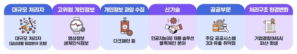 개인정보위는 위험성이 높은 6대 분야인 △대규모 개인정보처리자 집중 점검 △고위험 개인정보 △개인정보 과잉수집 △신기술 △공공부문 △처리구조 환경변화를 집중 점검하기로 했다.