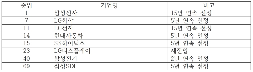 LG화학도 7위에 랭크돼, 상위 10위권내 한국업체는 총 2곳였다. 일본은 캐논과 혼다, 토요타 등 총 5개사가 톱10에 선정돼 가장 많았다. 중국도 2곳, 미국은 1곳이 각각 상위 10위권을 지켰다.
