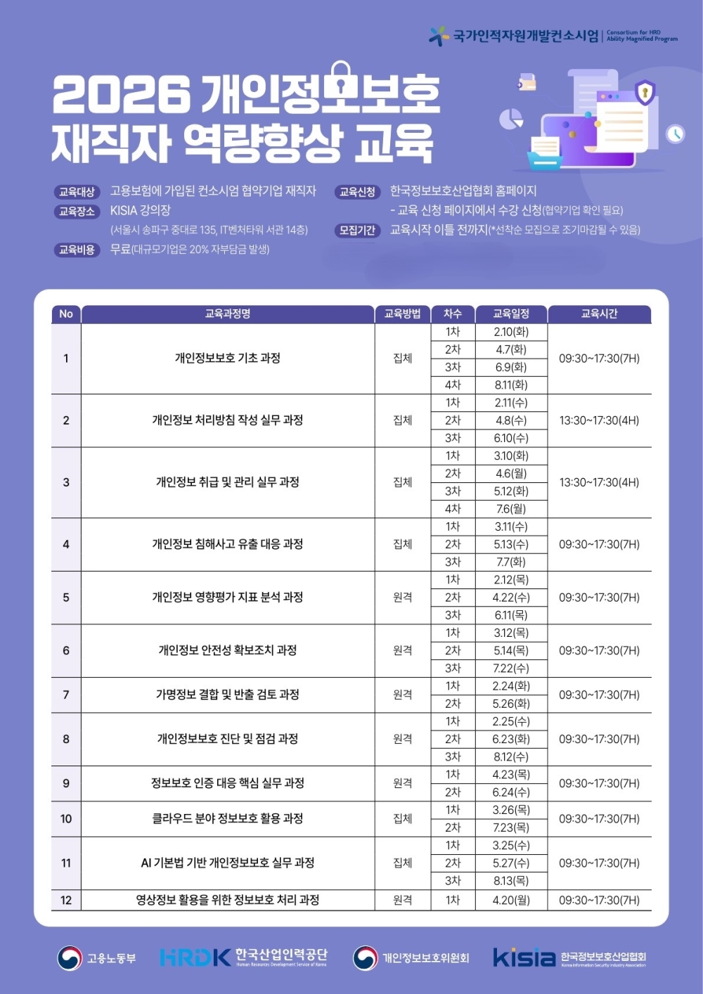 26일 한국정보보호산업협회(KISIA, 회장 조영철)는 2월부터 개인정보보호 국가인적자원개발컨소시엄 재직자 역량향상 교육을 개강한다고 밝혔다.