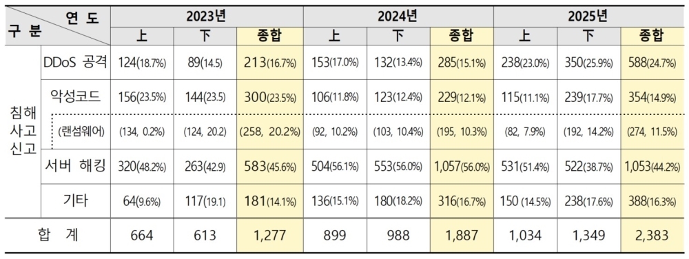2025년 침해사고 신고 전년 대비 26.3% 증가... 하반기는 전년 대비 36.5% 폭증