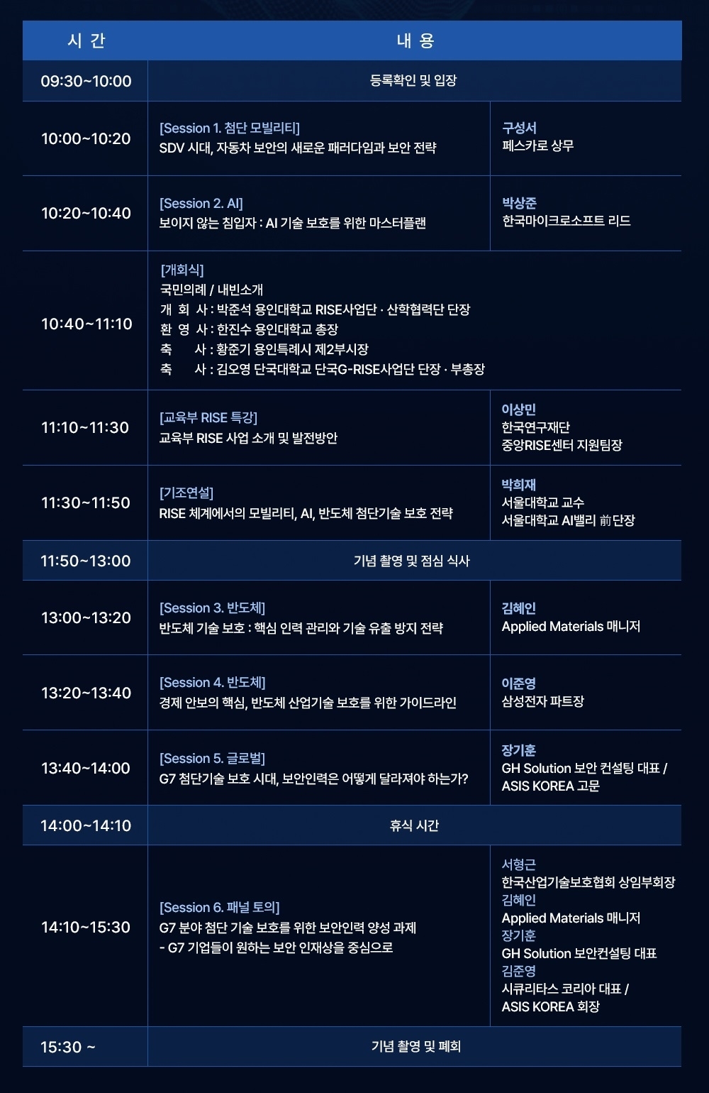 삼성전자가 반도체 공급망 보안 협력을 중심으로 주요 사례를 공유하고, 한국마이크로소프트는 AI로 촉발된 새로운 AI 위협환경과 AI 보안 사고 사례를 소개한다. 아울러 글로벌 반도체 기업 어플라이드 머티어리얼즈와 국내 대표 자동차 보안 기업 페스카로가 반도체와 모빌리티 보안의 중요성을 강조한다.