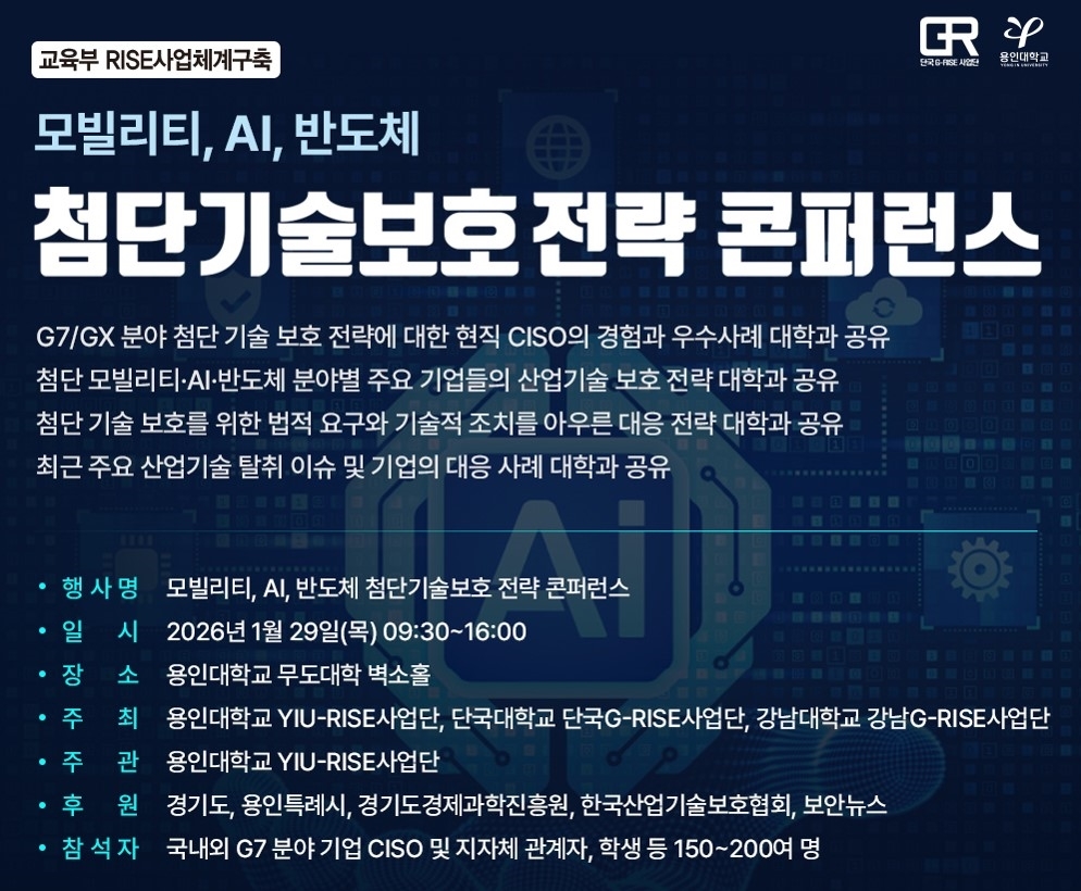 [보안뉴스 원병철 기자] 글로벌 기술 패권 경쟁이 심화하는 가운데, 대한민국의 미래 먹거리인 첨단산업의 핵심 기술을 보호하고 보안 생태계를 구축하기 위한 전략을 모색하는 자리가 마련된다. 용인대학교 YIU-RISE사업단은 1월 29일(목) 10시 용인대학교 무도대학 벽소홀에서 ‘모빌리티, AI, 반도체 첨단기술보호 전략 콘퍼런스’를 개최한다.