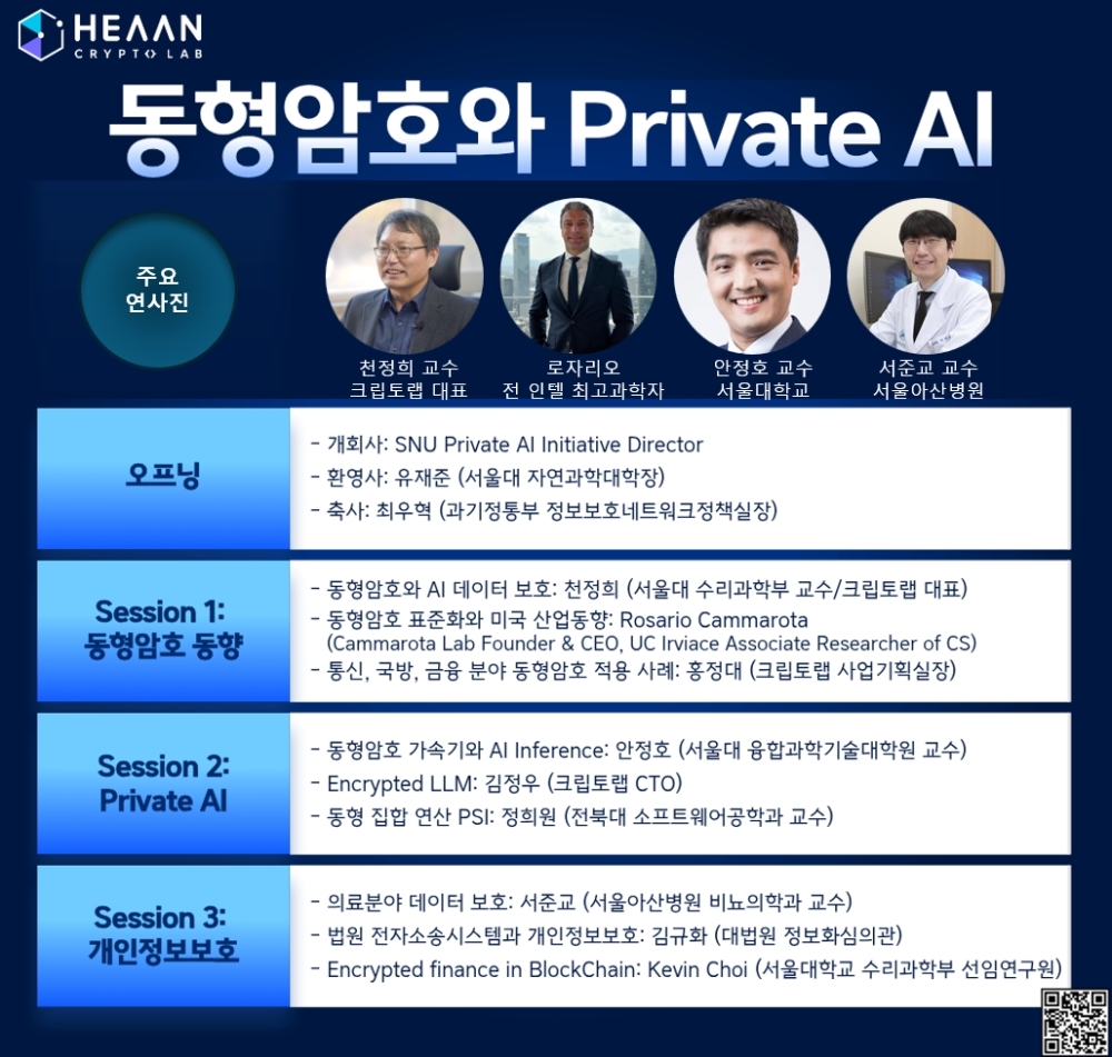 동형암호 원천기술 기업 크립토랩(CryptoLab, 대표 천정희)은 오는 2월 26일 서울대학교 상산수리과학관에서 국내외 암호·AI 분야 최고 전문가들과 함께 ‘동형암호와 프라이빗(Private) AI 세미나’를 개최한다고 24일 밝혔다.