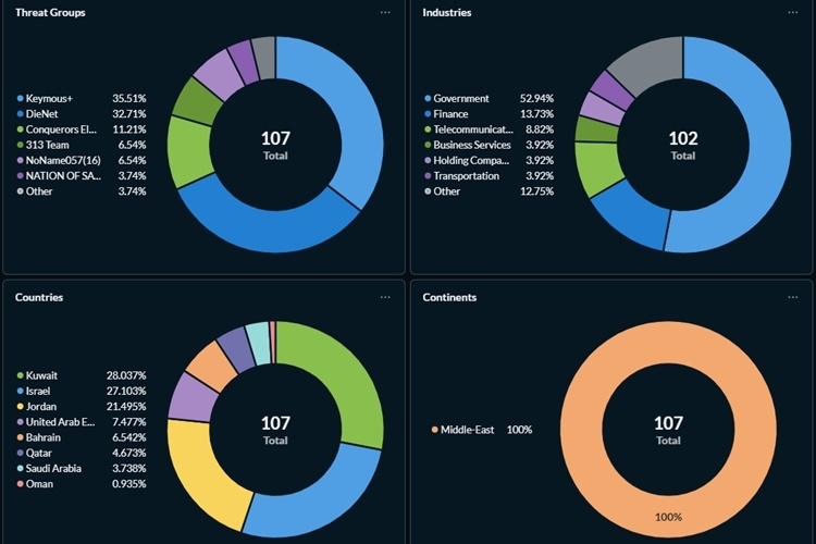 공격은 정부 기관(47.8%)에 집중됐고 금융(11.9%)과 통신(6.7%) 부문이 뒤를 이었다. 지역별로는 전체 149건 중 107건이 중동 지역에 발생했다. 국가별 피해 비중은 쿠웨이트(28%), 이스라엘(27.1%), 요르단(21.5%) 순으로 집계됐다.