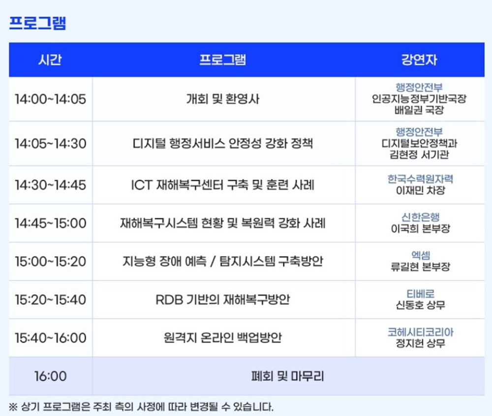 배일권 행정안전부 인공지능정부기반국장의 환영사를 시작으로 김현정 행정안전부 디지털보안정책과 서기관이 ‘디지털 행정서비스 안정성 강화 정책’ 강연이 진행된다. 이어 이재민 한국수력원자력 차장의 ‘ICT 재해복구센터 구축 및 훈련 사례’와 이국희 신한은행 본부장의 ‘재해복구 시스템 현황 및 복원력 강화 사례’, 그리고 류길현 엑셈 본부장의 ‘지능형 장애 예측/탐지 시스템 구축 방안’이 이어진다.