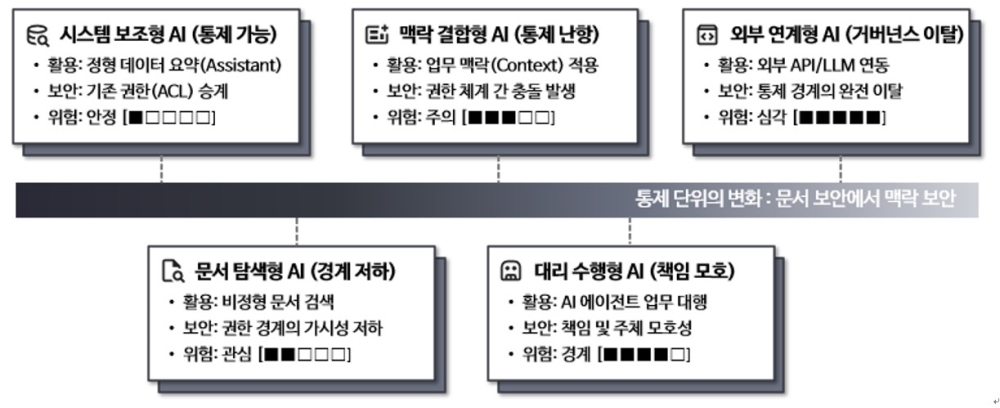 많은 조직이 AI 도입의 위험을 기술 문제로 인식하지만, 실제 위험은 데이터가 결합되고 활용되는 방식에서 발생한다. 아래 그림은 AI 활용이 확장되는 과정(시스템 보조 → RAG(Retrieval-Augmented Generation) 기반 문서 탐색 → 맥락(Context) 기반 활용 → AI Agent의 대리 수행 → 외부 API 연계)에서, 보안 위험이 어떻게 구조적으로 변화하는지를 단계별로 보여준다.