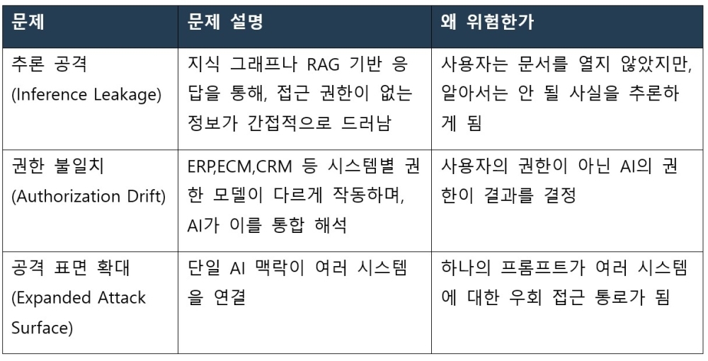 RAG 구조는 이 문제를 더욱 증폭시킨다. 문서가 조각 단위로 분해되고 재조합되면서 접근 통제의 기준이었던 문서 단위 보안은 더 이상 작동하지 않는다.