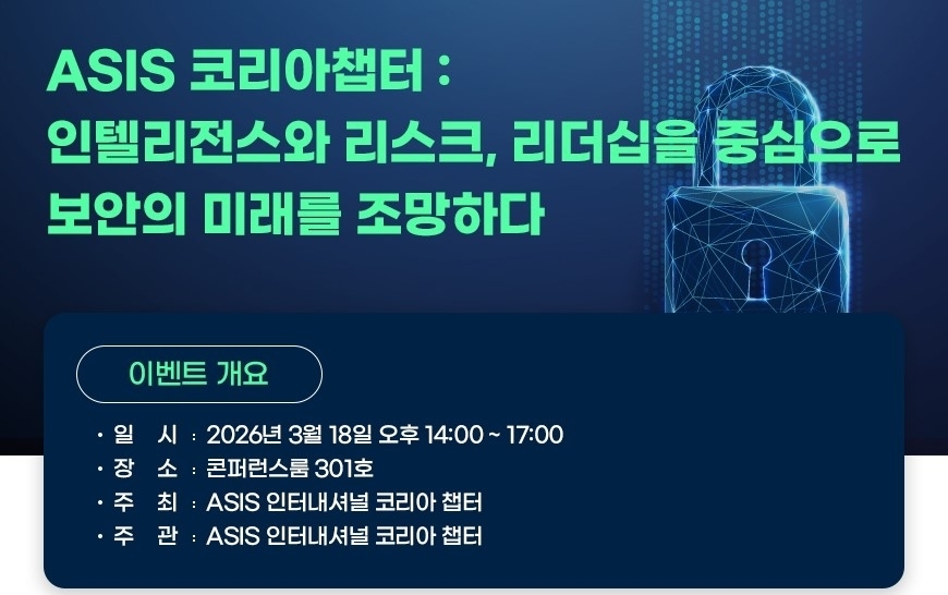 이 행사는 ‘ASIS 코리아챕터: 인텔리전스와 리스크, 리더십을 중심으로 보안의 미래를 조망하다’를 주제로 18일 오후 2시 킨텍스 콘퍼런스룸 301호에서 열린다. ASIS 코리아 챕터가 주최하며, SECON & eGISEC 2026 동시개최 행사다.