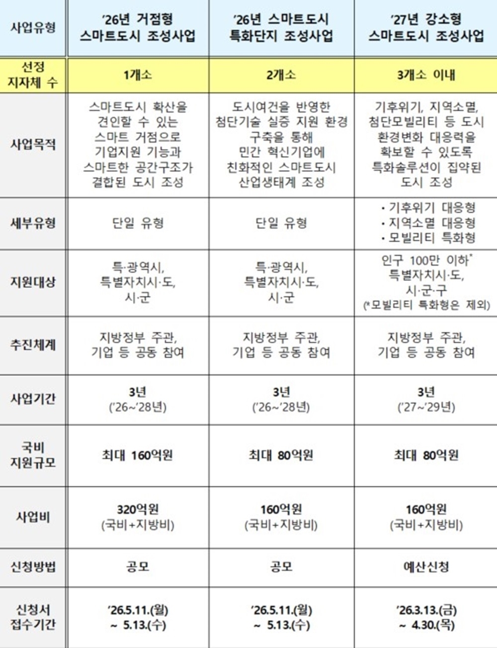 ‘거점형 스마트도시 조성사업’과 ‘스마트도시 특화단지 조성사업’의 경우 2026년 사업을 추진할 지방정부를 공모하여 총 3곳을 선정하고, ‘강소형 스마트도시 조성사업’은 지방정부 주도로 지역 여건에 적합한 스마트도시를 자율적으로 조성할 수 있도록 2027년 지원 기준을 안내한다.