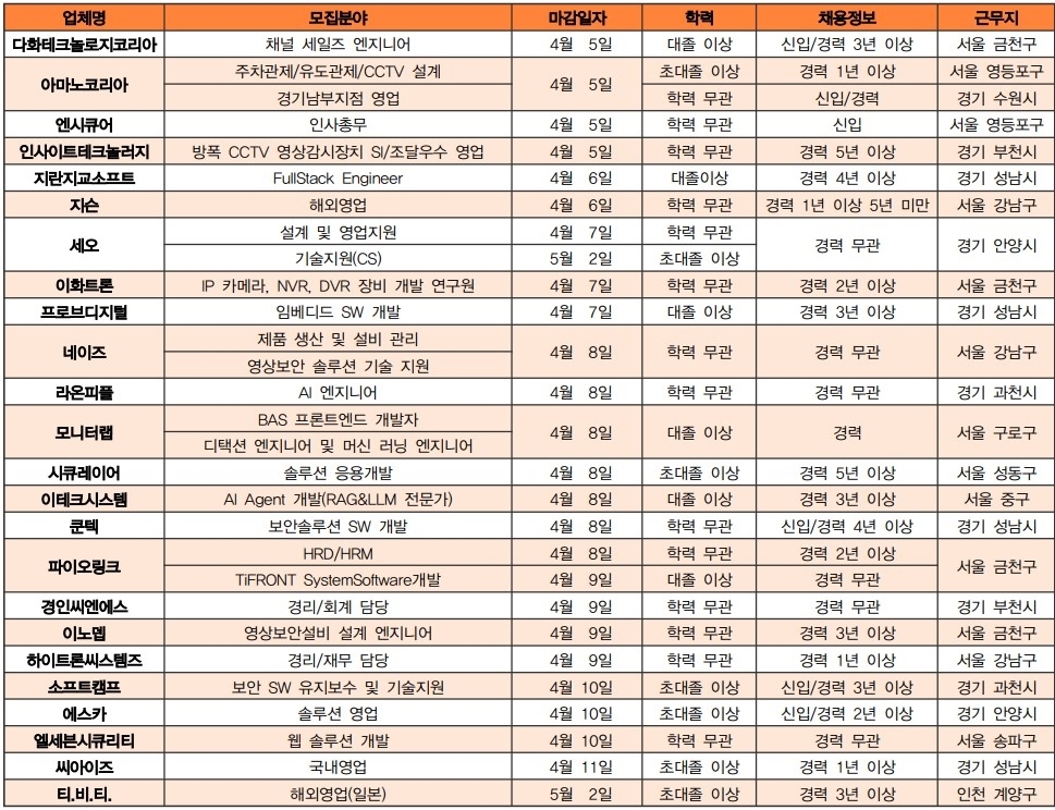 2026년 4월 물리&정보 보안 기업들의 분야별 인재 채용 동향 정리