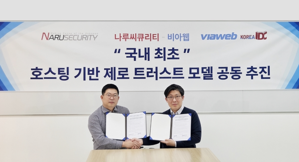 나루씨큐리티와 호스팅 서비스 기업 비아웹(코리아IDC, 대표 박오찬)이 중소·중견기업을 위한 ‘제로트러스트 호스팅’(ZeroTrust Hosting) 모델 개발 및 사업 협력을 위한 업무협약을 체결했다고 6일 밝혔다.