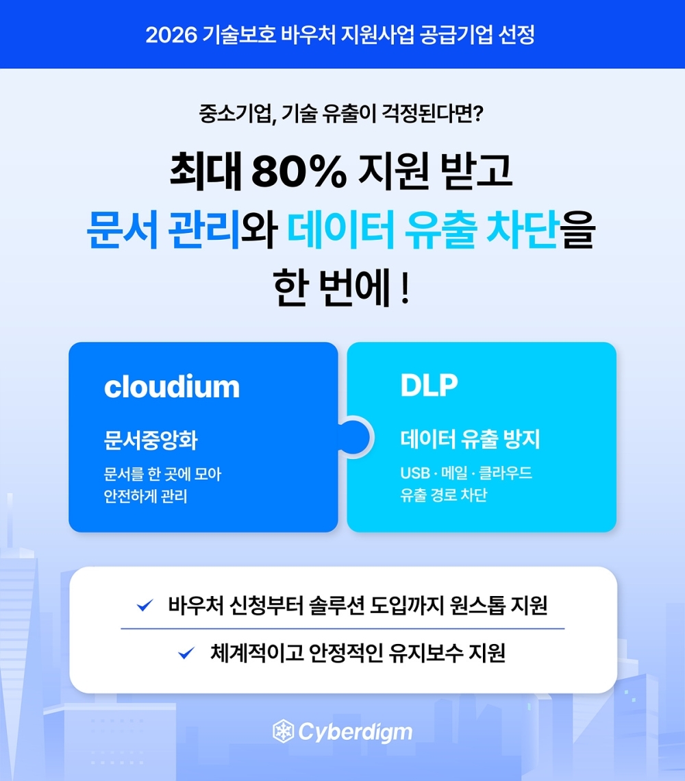 [보안뉴스 원병철 기자] 문서중앙화 및 보안 전문기업 사이버다임(대표 김경채)은 중소벤처기업부가 주관하는 ‘2026 중소기업 기술보호 바우처 지원 사업’의 공급기업으로 선정되어, 중소기업의 핵심 자산 보호를 위한 솔루션 공급에 본격 나선다고 밝혔다.