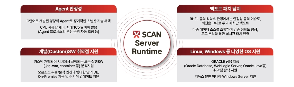 XSCAN Server Runtime은 소프트웨어 자재명세서(SBOM·(Software Bill of Materials) 기반 구성요소 정보를 활용하는 동시에, 실제 런타임 환경에서의 호출 흐름과 행위를 함께 분석한다. 이를 통해 단순 설치 목록 기반 관리에서 벗어나, 실제 사용 중인 컴포넌트와 실제 악용 가능성이 높은 취약점의 연관성을 정밀하게 식별할 수 있다.