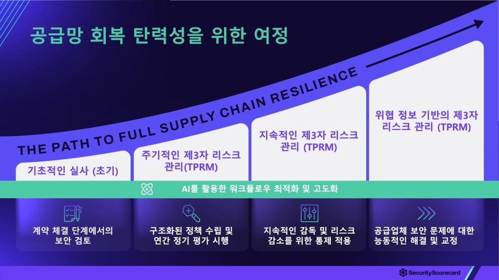 이에 따라 TPRM의 진화도 진행 중이다. 시큐리티스코어카드는 “AI가 기계적 속도로 취약점을 공략하는 환경에서 설문지와 감사에 의존하는 기존 ‘체크박스’ 방식은 ‘허위적 안도감’만 제공할 뿐”이라며 “지속적 모니터링, 실제 공격자 신호와 결합된 방어 우선순위, 방대한 데이터를 연결해 필요한 조치를 제안하는 에이전틱 AI 오케스트레이션 등을 중심으로 한 차세대 TPRM으로 거버넌스와 비즈니스 회복탄력성을 연결할 것”이라고 밝혔다.
