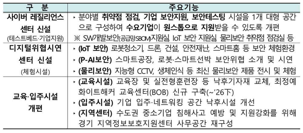 판교 정보보호클러스터는 2017년 개소한 이래 보안스타트업 육성 및 수도권 보안 인재 양성의 거점으로 자리매김해왔으나, 시설 노후화로 활용도가 떨어지는 문제가 있었다. 이에 과기정통부는 산업계 수요 및 전문가 의견을 반영해 약 1년 간 기업 정보보호 통합지원 및 체험시설, 입주·교육시설 등을 아래와 같이 대폭 개선했다.