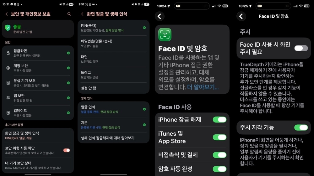 ▲안드로이드폰 화면 잠금 설정(좌측 2개)과 아이폰 화면 잠금 설정(우측 2개)[출처: 보안뉴스]