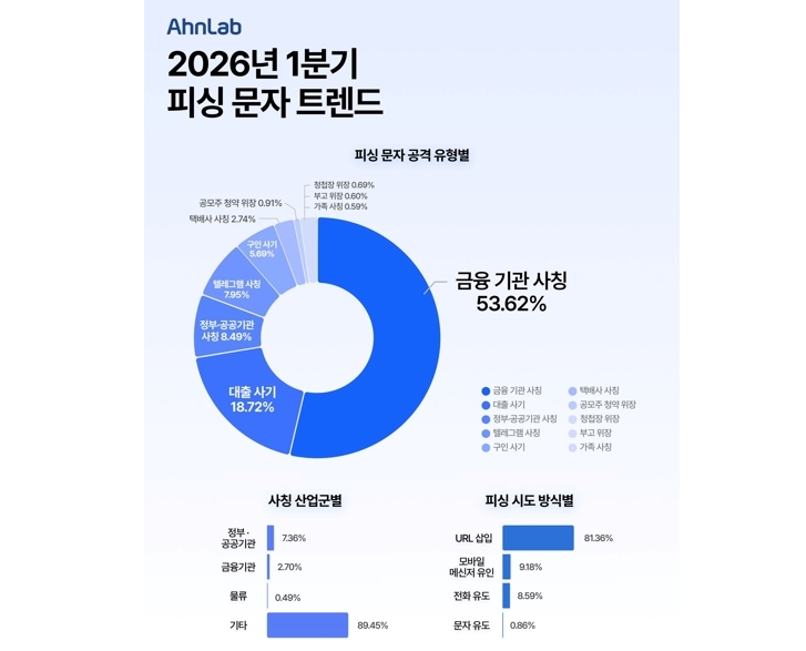 안랩(대표 강석균)은 2026년 1월부터 3월까지 에이전틱 AI 보안 플랫폼 ‘안랩 AI 플러스’(AhnLab AI PLUS)로 다양한 피싱 문자를 탐지·분석한 결과를 담은 ‘2026년 1분기 피싱 문자 트렌드 보고서’를 16일 발표했다.