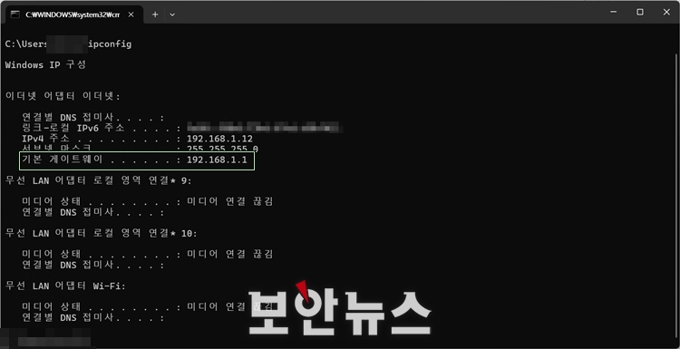 ▲윈도우 ‘실행’(Win+R cmd) 창에서 공유기 설정 주소 확인 방법 [출처: 보안뉴스]