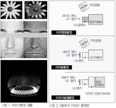 자외선 촬영은, 크게 나누어 3종류가 있다(그림 1 참조). 세 가지의 샘플 화상은 위에서부터 화초의 형광촬영, 멜라닌색소의 자외반사 촬영, 연소의 발광촬영을 나타낸다.