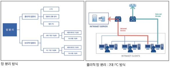 인터넷 망과 업무 망을 분리하는 망 분리 방식은 크게 물리적 망 분리와 논리적 망 분리로 나눌 수 있다. 물리적 망 분리는, 업무용 망과는 별도로 인터넷 망을 위한 네트워크를 가설하고 인터넷 접속용 PC도 물리적으로 분리하는 방식을 일컫는다. 논리적 망 분리는, 물리적으로는 실제 네트워크가 구분되어 있지 않지만, 가상화 기술 등 다양한 IT 보안 기술을 사용하여 업무용 망과 인터넷 망이 물리적으로 분리되는 효과를 볼 수 있도록 구현하는 방식이다.