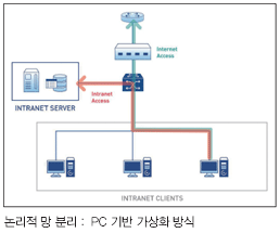 PC 기반 가상화 방식으로 망 분리를 하기 위해서는 업무 영역과 인터넷 영역의 접속을 구분하는 고성능 망 분리 전용 어플라이언스와 PC 가상화 기술을 이용해 인터넷 영역의 격리성을 확보하는 가상화 프로그램, 그리고 정책 설정, 모니터링 기능을 수행하는 관리 서버가 필요하다.