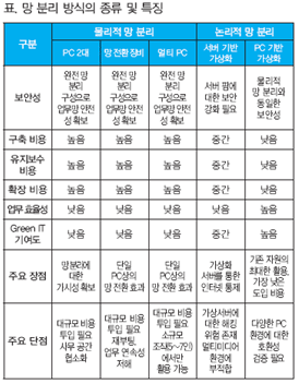 위 표 1에서 볼 수 있듯이, PC 2대 방식을 비롯한 물리적 망 분리 방식은 보안성이 가시적으로 확보된다는 장점 외에 비용이나 공간 활용 등의 측면에서 논리적 망 분리 방식 대비 효율성이 떨어진다. 논리적 망 분리 방식 중 하나인 서버 기반 가상화 방식은 PC 기반 가상화 방식과 비교할 때 구축, 유지보수, 확장비용이 많이 소요되며, 멀티미디어 환경에는 적합하지 않다. 서버 기반 가상화 방식의 경우 제한된 업무를 수행하는 업무의 중앙집중화에는 유용할 수 있으나 범용적인 인터넷 사용 환경이 보장되어야 하는 망 분리 솔루션에는 적합하지 않은 방식이다. 표 1에서 보듯이 물리적 망 분리와 동일한 보안성을 확보하면서도 구축, 유지보수 비용 및 사용성을 고려한다면 PC 기반 가상화 방식이 가장 적합한 방안이라고 할 수 있다.