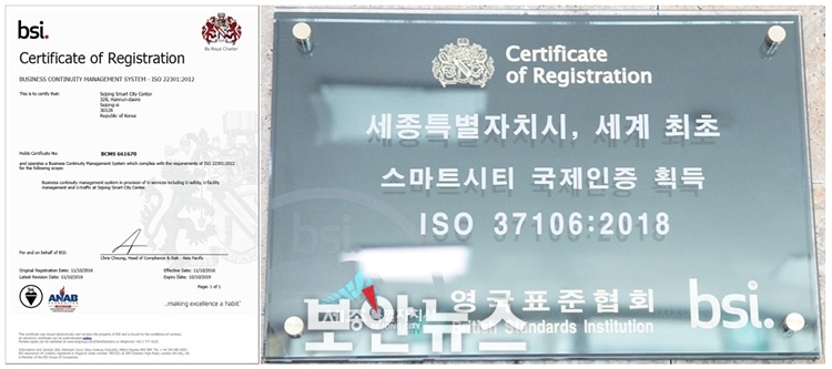 2018년 12월에는 세계최초로 영국표준협회(BSI)로부터 스마트시티 사업성과 성숙도 면에서 세계 수준을 갖춘 도시에 부여되는 스마트시티 국제인증(ISO37106)을 획득했다. 세종 스마트시티는 도시비전과 로드맵, 시민혜택 등 22개 평가지표에서 평균 레벨3(성숙) 단계를 획득했다. 이와 함께 세계 최고의 IT 분야 시장분석 및 컨설팅 전문기관인 IDC가 주관하는 ‘2020 스마트시티 아시아/태평양 어워드’에서는 공공안전-스마트치안 부문 최우수 도시로 선정됐다. 여기에서는 △통합플랫폼 112·119·재난안전상황실 연계 등 범죄 대응 △‘세종엔’을 통한 활용 안전·교통·환경 등 76종 데이터 제공 △모바일 비상벨 세종안심이앱 △CCTV비상벨과 음악방송 등 범죄 예방 △지능형(AI) 영상관제 기술 도입 추진 등에서 호평을 받았다.